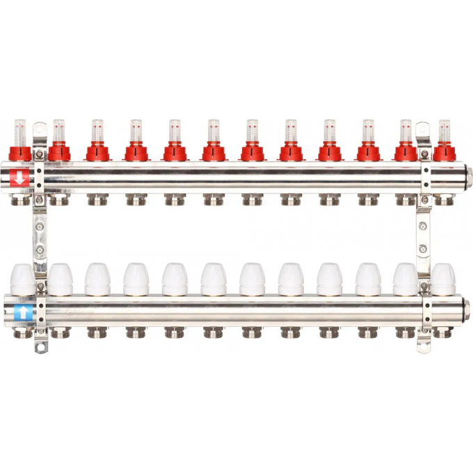 Коллекторный блок со встроенными расходомерами выпускается для распределения теплоносителя к потребителям в системах водяного отопления – радиаторам, конвекторам, петлям теплого пола, обогрева открытых площадок. Рабочая температура теплоносителя – до 95 °С, давление – до 10 бар. Коллекторы с регулирующими вентилями позволяют сбалансировать расход по ответвлениям.